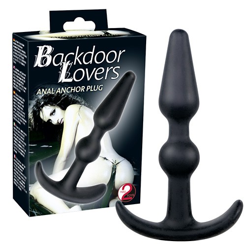 Zwarte anaalplug in ankervorm met bolverdikking aan de schaft en greepvleugels.