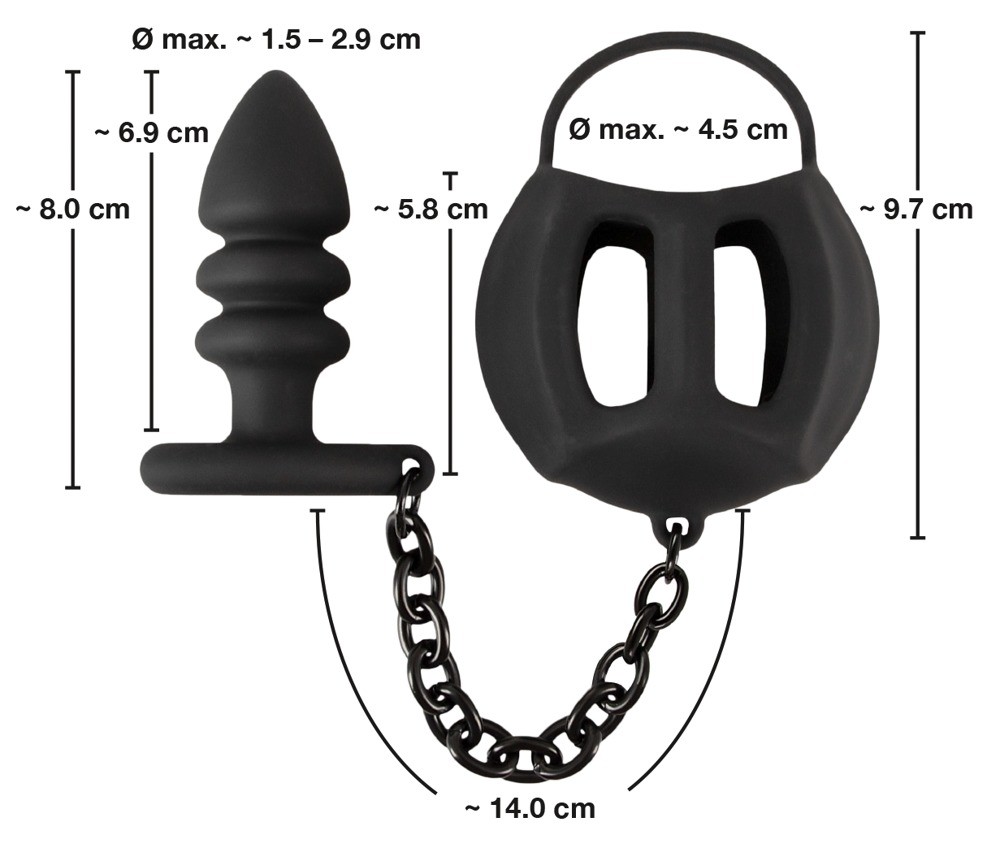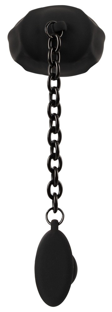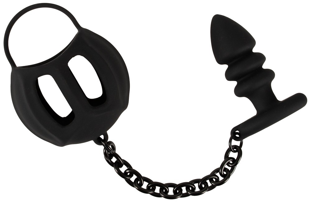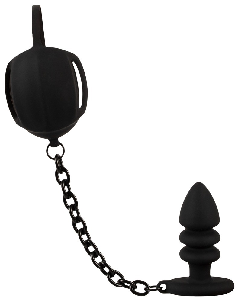 en verbindt deze via een robuuste ketting met de uitgesproken geribbelde anaalplug.