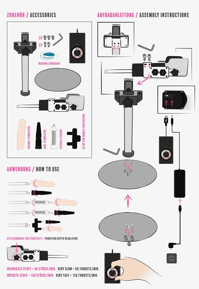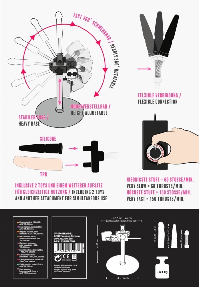 Seks machine met in hoogte verstelbare standaard en twee opzetstukken.