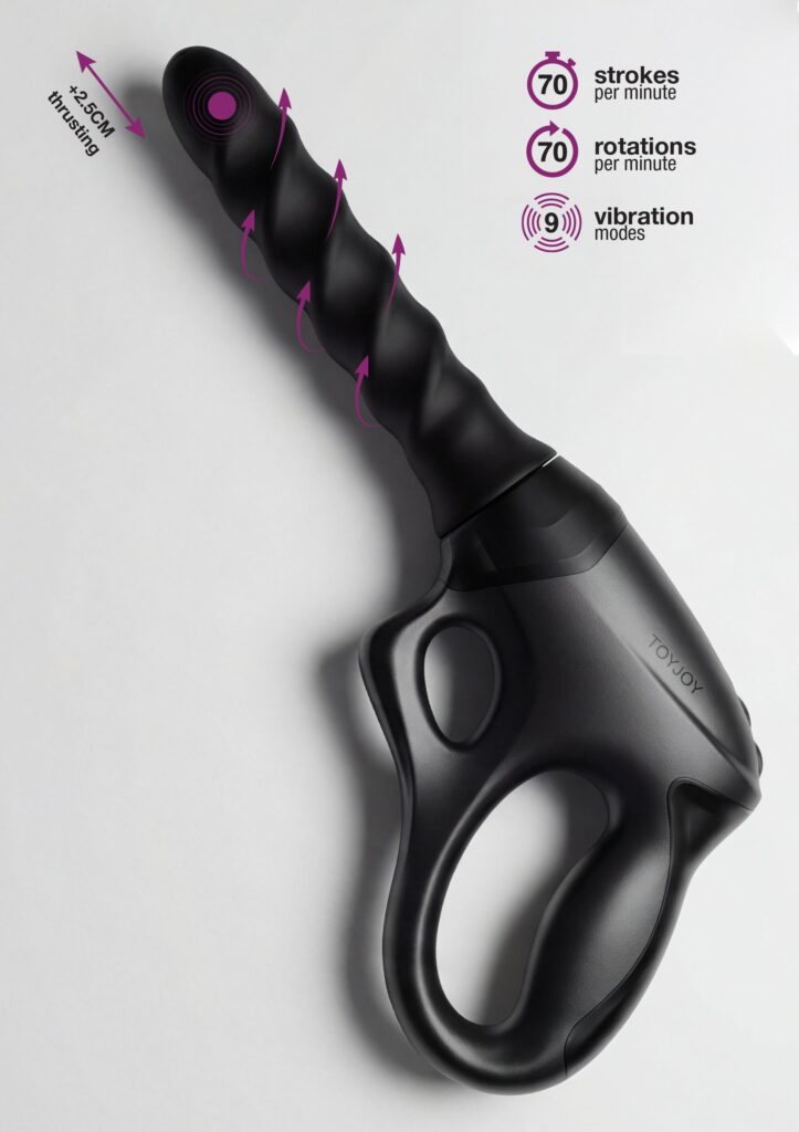 Met zijn unieke pistoolgreep biedt het apparaat een comfortabele en veilige bediening, terwijl de innovatieve 360° draaiende, stotende en vibrerende schacht zorgt voor een meeslepend en krachtig innerlijk genot.