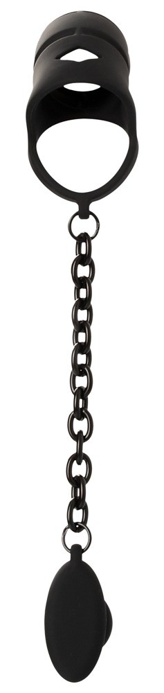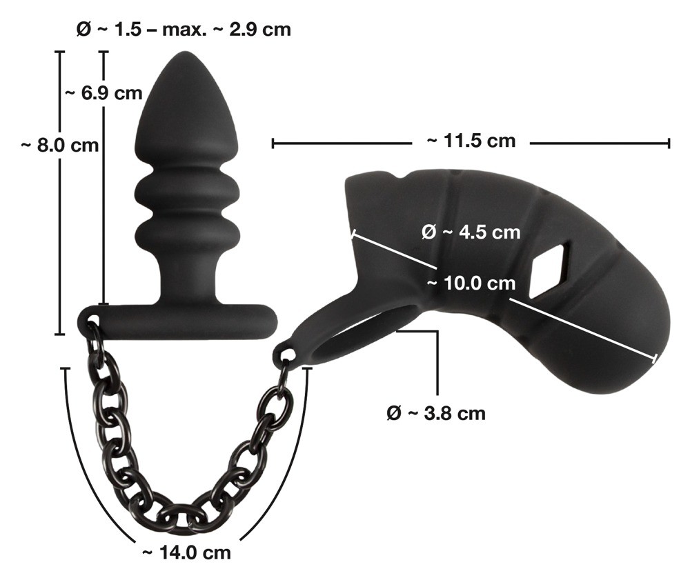 en verbindt deze via een robuuste ketting met de uitgesproken geribbelde anaalplug.