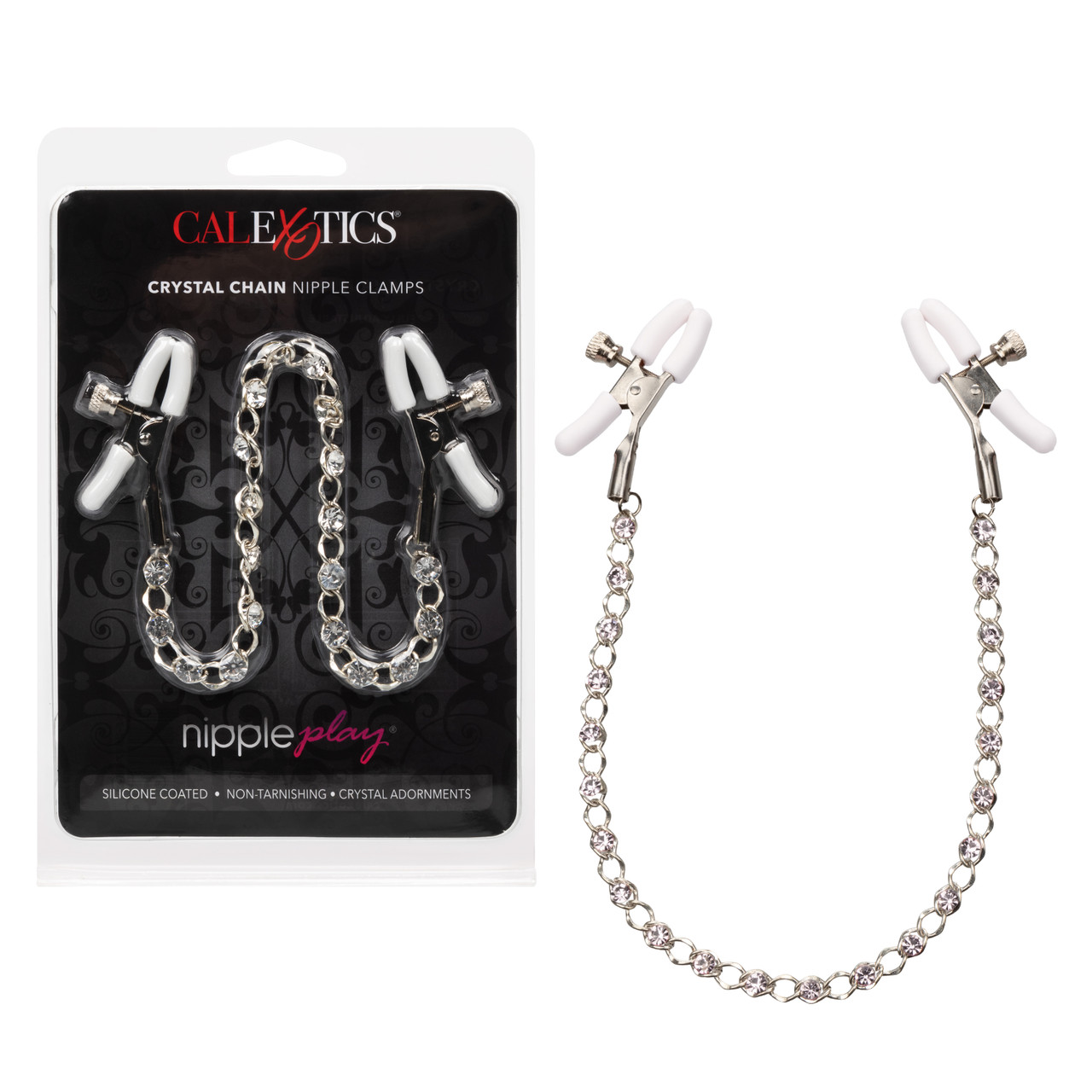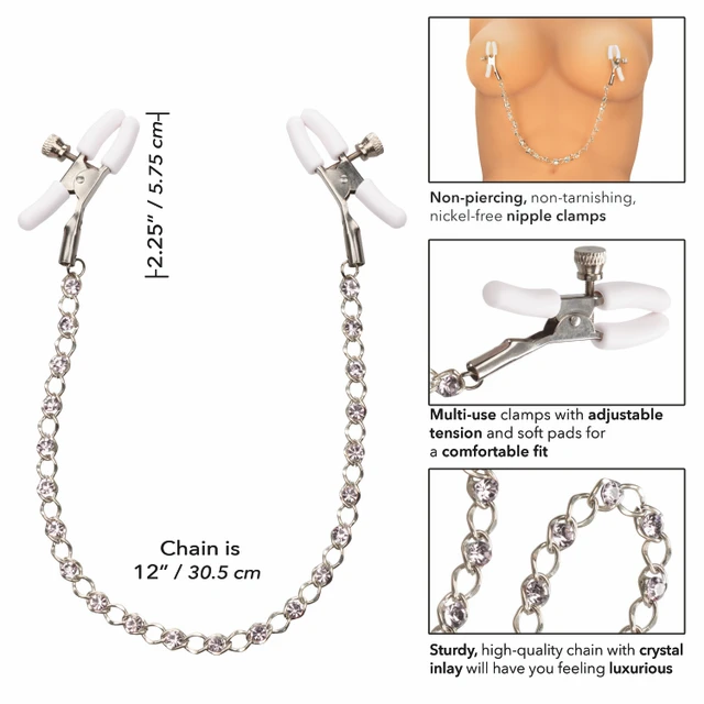 Ontdek een verhoogde sensatie met de 2 volledig verstelbare tepelklemmen, de prikkelende ketting en de sprankelende kristallen.