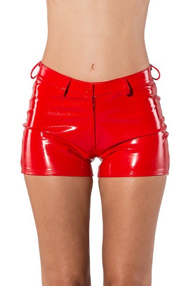 Knalrode hotpants, gemaakt van Datex, met een tailleband en riemlussen,