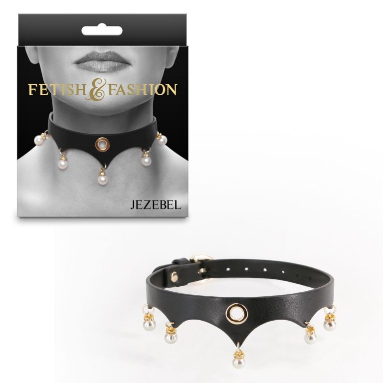 Jezebel is ontworpen voor nekomvang van 29.2 tot 40.6 inch en is verfraaid met gouden accenten en parels.