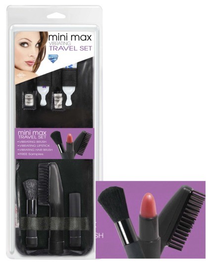 In de etui bevind zich het volgende …. Trillende Brush (lengte 15 cm), Vibrating Lipstick (ca. 9 cm), Trillende Hair Brush (10,5 cm), gratis monsters, batterijen. Alles netjes opgeborgen zodat niemand weet wat er in zit en waar het voor Dient. De grootste topper op alle beurzen van Europa !!!!!