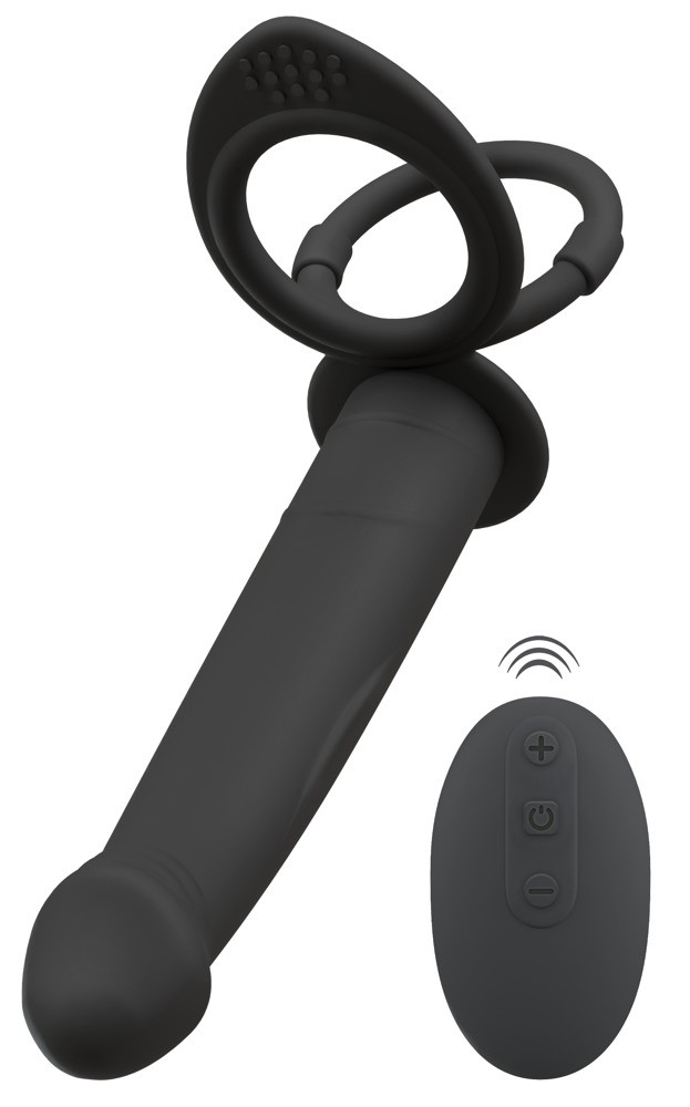 De slanke, lichtgewicht anale vibrator is stevig bevestigd aan de gecombineerde penis- en testikelring.