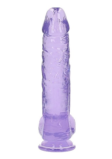 De transparante, paarse dildo van 25,4 cm met realistische ballen biedt je een intens vervullende ervaring.