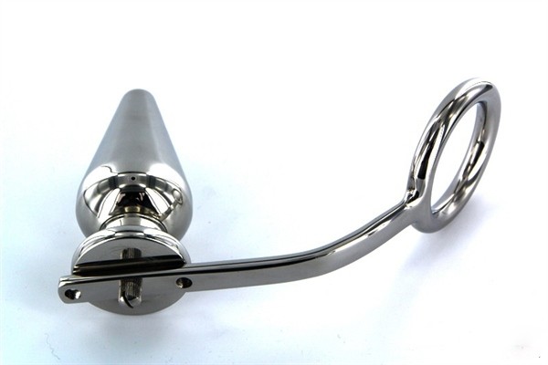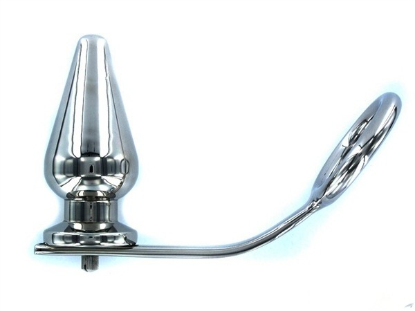 Extra zware, gepolijste roestvrij stalen cockring in combinatie met een verstelbare buttplug.