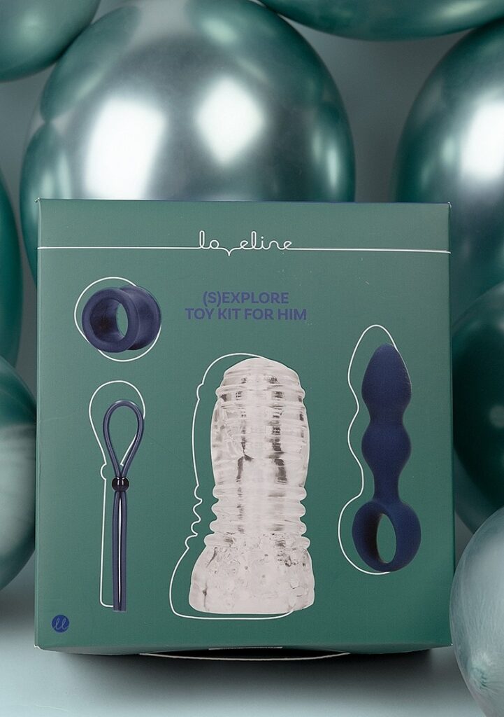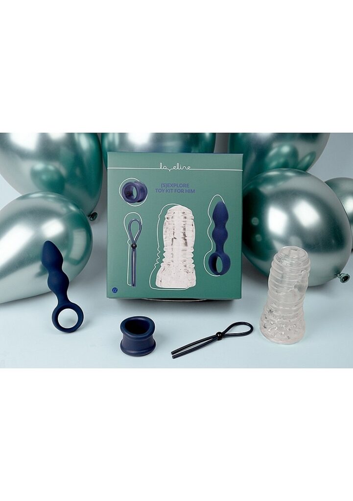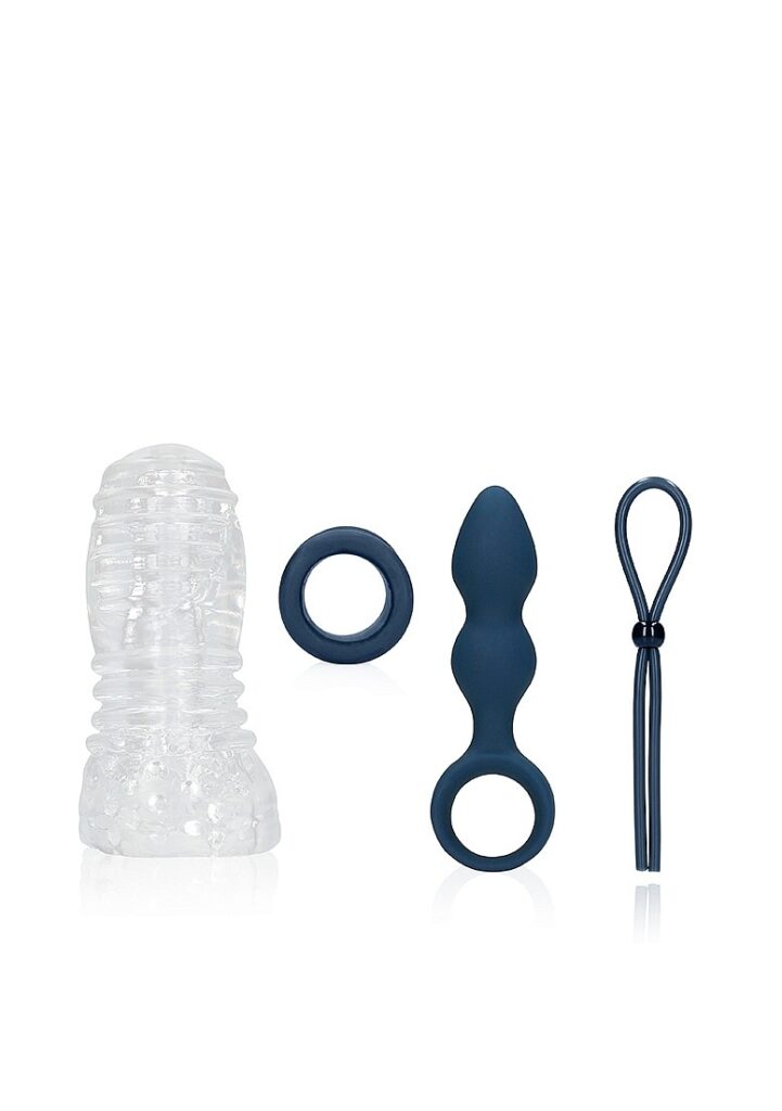 Bevat Inclusief een rekbare masturbator, een ball strap, een verstelbare cockring en een kleine teardrop shaped anal plug.