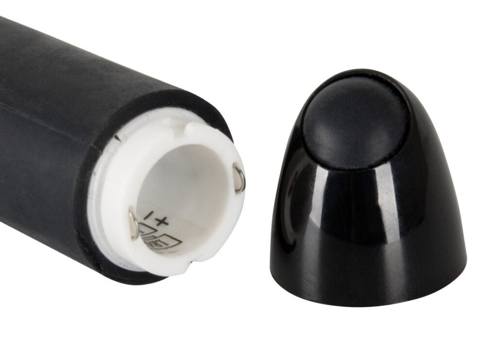 Deze naadloos vervaardige, zwarte vibro-dilator wordt behoedzaam in